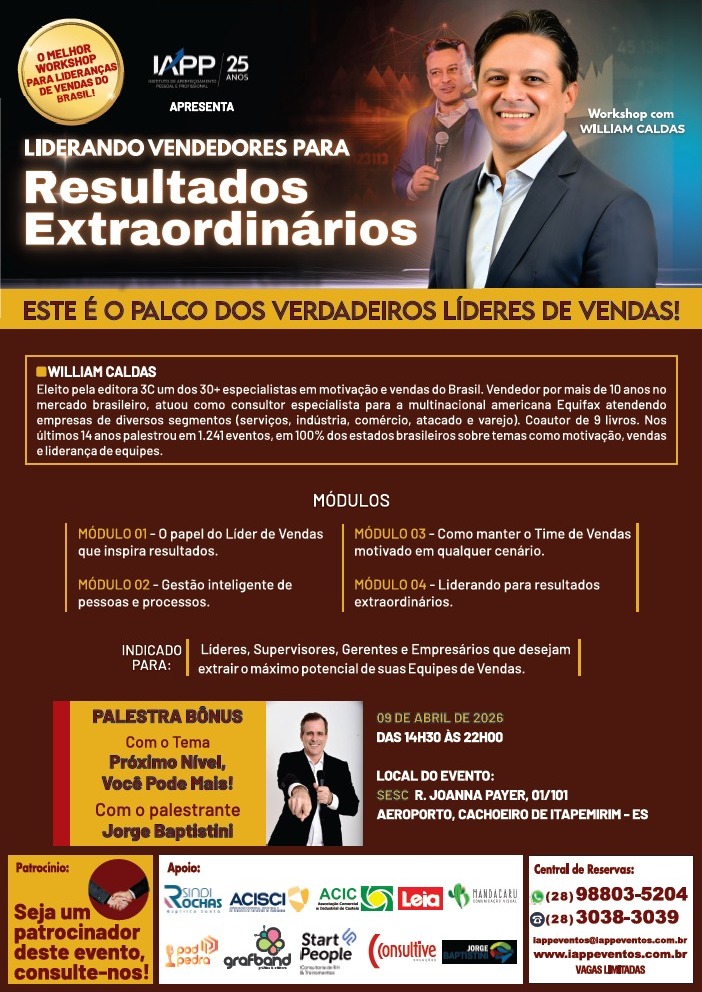 🚀 Workshop Exclusivo: Um dia inteiro com WILLIAM CALDAS, nota máxima na avaliação dos participantes nos eventos realizados pelo IAPP Eventos Empresariais.